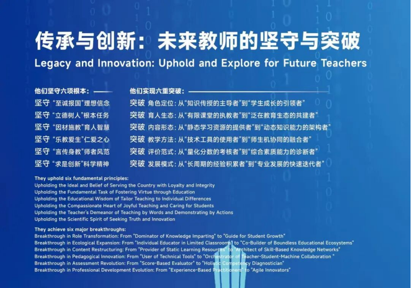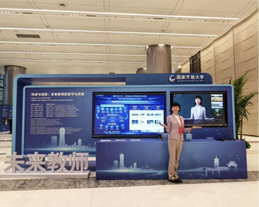 在论坛成果展上,国家开放大学展示了“数智赋能终身教育泛在可及”的实践成果,以及在教育家精神引领下未来教师精神内核的“六个坚守”和能力素养的“六大突破”,同时,沉浸式展示了未来教师与数智分身“人机协同”的新型教学模式。